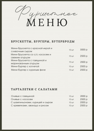 Также предусмотрено разнообразное фуршетное меню с холодными и горячими закусками, десертами и напитками, что удобно для встреч, где важны общение и свободное перемещение гостей.